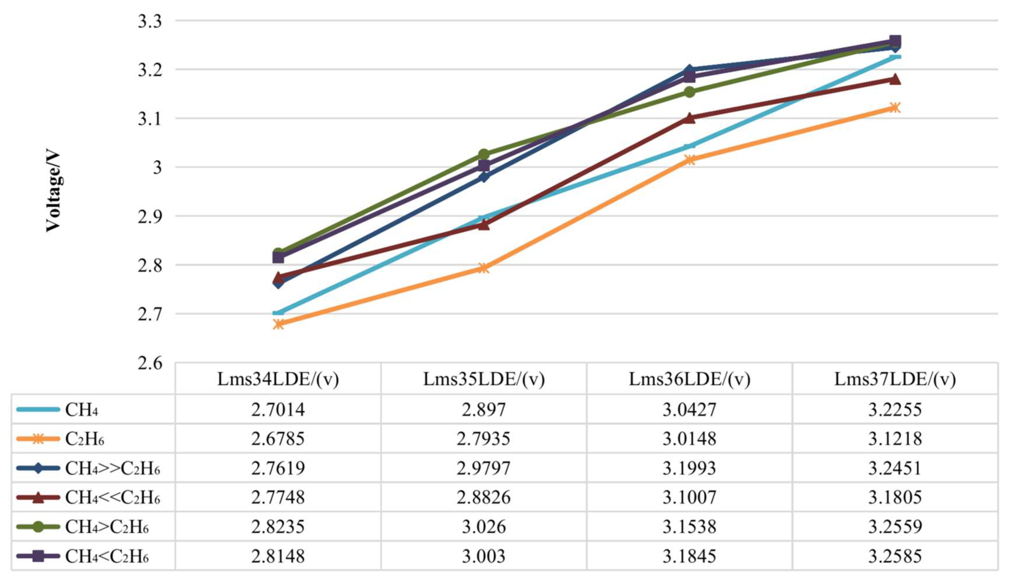 4, 60% ethane). The absorption information of the four light sources under several different gas samples is shown in