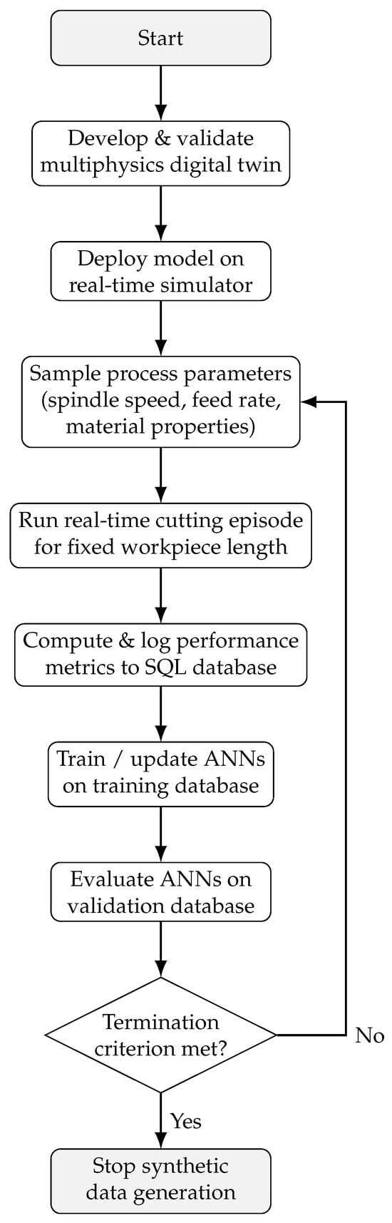 Flowchart of the proposed methodology for synthetic data generation and ANN training using a real-time digital twin of the machining process.