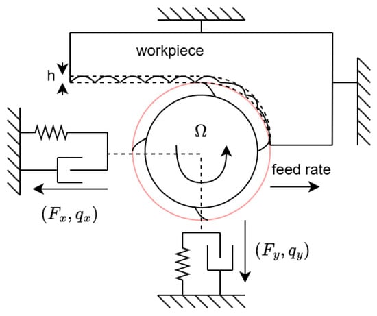 The multiphysical model of the machine is mainly inferred from the physics and validated using several milling tests. The modelling is carried out in Simulink using the specialized electrical power system toolbox. The electromechanical model of two motors is implemented and it is interfaced with a nonlinear mechanistic model of the cutting tool. The nonlinear mechanical model can determine not only the forces acting on the lead to intense vibrations that can ruin the surface roughness of the final product, which can be modelled as proposed in [19,20] and modelled and is briefly discussed here. Figure 5 illustrates the physics of the cutting where all mechanical coefficients used in the vibration model are: and , damping coefficients and , and stiffness values and . These parameters were identified through impact-hammer tests conducted by the manufacturer and refined using vibration measurements obtained during the cutting experiments. Thermal stresses were not included in the present model because the profiling operations studied have very short engagement durations (typically 2–5 s), during which the measured spindle temperature rise was below 1 °C. Preliminary tests using onboard temperature sensors confirmed that the thermal transient is negligible compared to the mechanical and electrical dynamics. Additionally, the current real-time model focuses on electromechanical interactions, and integrating a full thermal subsystem is part of future development.