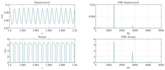 In Figure 6, illustrates the simulated tool displacement and spindle torque together with their spectral densities. The dominant peaks observed in both spectra correspond to the tooth-passing frequency , confirming that the mechanistic force model correctly reproduces periodic force excitation caused by the cutting edges. The displacement spectrum also reveals secondary harmonics associated with chip-thickness modulation, which directly influence the surface-quality index used later in the ANN training. These findings demonstrate that the vibration amplitude predicted by the reduced-order model captures the fundamental dynamics governing surface roughness, thereby validating the model’s suitability for generating synthetic datasets. The parameter used are listed in Table 1. Those parameters were selected based on a combination of manufacturer specifications for the tool and spindle, direct measurement of geometric and dynamic quantities, and standard values reported in milling literature. Candidate parameters such as tool run-out, spindle bearing compliance, and thermal drift were evaluated during preliminary tests; however, their inclusion did not significantly improve model accuracy within the short cutting intervals considered. For this reason, the final parameter set balances physical completeness and real-time feasibility while maintaining strong agreement with the experimental validation data.
