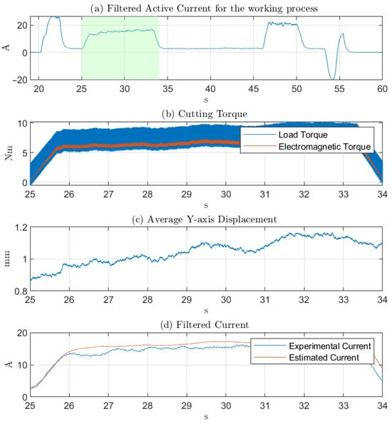 The digital twin is validated through a systematic comparison between simulated responses and experimental measurements collected on the physical CNC profiling machine. The objective is to ensure that the multiphysics model accurately captures the coupled electrical, mechanical, and cutting dynamics under a broad range of operating conditions. A dedicated set of machining tests is carried out on the real machine, covering representative combinations of spindle speeds, feed rates and tool engagement conditions. During each test, high-frequency measurements of spindle current, axis torques and tri-axial vibration signals are acquired using synchronized data-acquisition hardware. These measurements, after appropriate filtering and time alignment, form the ground-truth dataset used for validation. In Figure 7 the simulation is compared with the experimental data for the filtered active current. The filtered active current is measured before the DC-AC converter of the spindle and represents the active power delivered to the spindle with acceptable accuracy. In Figure 7a, the filtered active current is presented for the whole process. The green zone is used to present the other quantities. The Figure 7b highlights the load and active torque vibrations estimated with the mechanistic model, while in Figure 7c, the displacement over the y-axis is presented. Finally, the real data for the active current are compared to the model estimation in Figure 7d. For this simulation, the offset for the specific cutting energy for the testing material (pine wood, Figure 3) has been tuned to 35 with for the noise component in Equation (5).