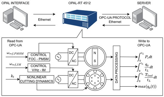 The validated digital twin is deployed on a real-time simulator. The model is executed with a fixed integration step suitable to capture the fastest electrical dynamics while preserving real-time capability. An OPC UA interface connects the real-time hardware to an external server that acts both as a supervisory controller and as a data management system. For each cutting episode, the server sends a new set of process parameters to the real-time simulator, including spindle speed, feed rate, and material-specific cutting energy. The simulator tracks these references and performs the virtual machining of a fixed workpiece length. During the episode, relevant process quantities are computed in real time, such as instantaneous power, cumulative energy consumption, and average tool vibration amplitudes along the principal axes. At the end of the episode, summary performance indicators are returned to the server and stored in a structured SQL database together with the corresponding input parameters.