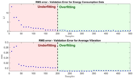 The trained weights and biases are then used as a starting point for the next training. A termination criterion for generating the synthetic database can be obtained by selecting a gradient threshold over the decaying RMS error. The resulting rms errors () for the two quantities are presented in Figure 9. An acceptable dataset size is selected at the end of the underfitting region, approximately at 220 cutting episodes. ANN performance was evaluated using both RMS error shown in Figure 9 and mean-square error (MSE). For each validation episode, the MSE was computed as where and denote the experimental and ANN-predicted performance indicators, respectively. The best-performing ANNs achieved an MSE of for energy prediction and for vibration amplitude, consistent with the convergence trend observed in the RMS curves of Figure 9. These results confirm the reliability of the ANN models for downstream optimization tasks.
