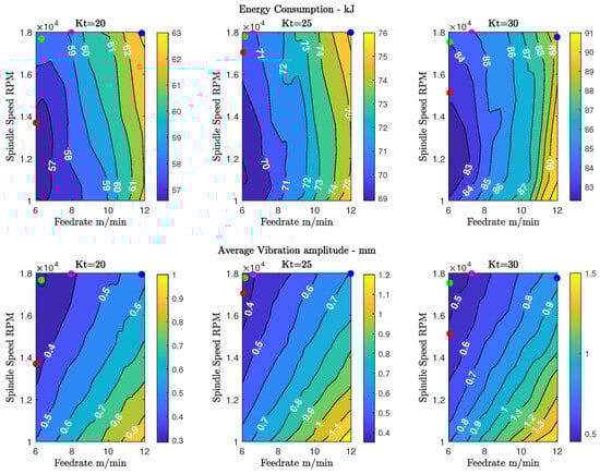 The trained ANNs are presented in Figure 10 as 3D isosurfaces and in Figure 11 as contour plots. As highlighted in Figure 10, the energy consumed and the spindle y-axis vibrations have different trends. The machine consumes more energy when it cuts tougher materials with higher feed rates. On the other hand, the vibrations increase for higher feed rates and material toughness and decreases when the spindle rotates faster. The ANN are evaluated for three different specific cutting energies () in Figure 11. Here, some markers on the contour plots highlight the best cutting parameters (spindle speed and feed rate) for different desired conditions. The parameters for these cutting operations are collected using a Genetic Algorithm (GA) optimization over the ANN models. The problem is formally stated in Equation (6):