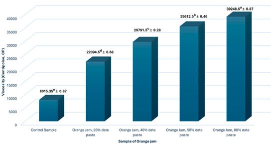 Viscosity of orange jam containing different proportions of date paste. Data are expressed as means ± standard error, number of replicates = 3. Data followed by the same letter are not significantly different (p ≤ 0.05).