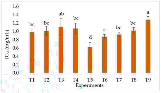 DPPH radical scavenging activity of coffee silver skin extract by different extraction conditions. Different lowercase letters indicate significantly different values within the same column at p < 0.05. T1–T9 represent nine groups of varying extraction conditions. For detailed parameters, please refer to Table 1.