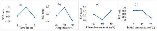 Response graph of larger-the-better quality characteristics for total phenolic content in various extraction conditions. (a) Time (min). (b) Amplitude (%). (c) Ethanol concentration. (d) Initial temperature (°C).