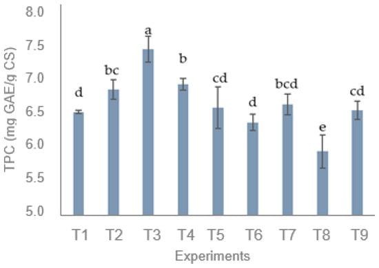 Total phenolic content (TPC) of extracts from coffee silver skin (CS) under different extraction conditions (T1–T9). Different lowercase letters indicate significantly different values within the same column at p < 0.05.