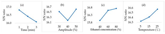Response graph of smaller-the-better quality characteristics for DPPH radical scavenging activity in various extraction conditions. (a) Time (min). (b) Amplitude (%). (c) Ethanol concentration. (d) Initial temperature (°C).