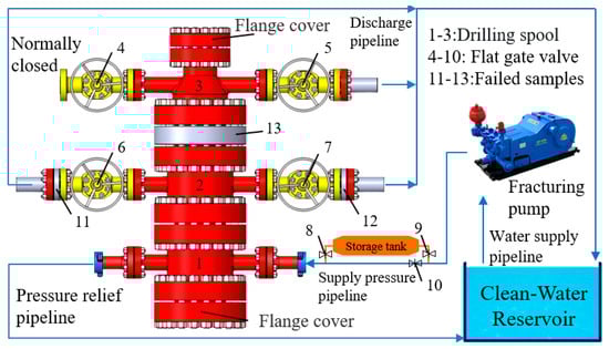The composition of the high-pressure plugging experimental system is shown in Figure 1, which is based on the drilling spools used on-site. The main body of the system was composed of three drilling spools (1–3), with the bottom of Spool No. 1 and the top of Spool No. 3 closed by flange covers. The experimental medium was clean water, and a fracturing pump was connected to the right side of Spool No. 1 to provide the pressure required for the experiment. The left side shows the pressure-relief valve and pressure-relief pipelines used for overpressure protection. When the internal pressure exceeds the set protection pressure, the pressure-relief valve opens automatically. The cracks were simulated using specially customized failure samples (11–13), which were placed on the left and right sides, as well as on the top of Spool No. 2, to simulate the possible cracks that may occur during the failure of the BOP. They were designed in three shapes: circular (Φ = 5 mm), rectangular (5 × 60 mm), and square (8 × 30 mm). Individual or joint testing of each failed sample can be achieved by opening and closing plate gate valves 5, 6, and 7. After the experiment, the plugging material and water were returned to the clean water reservoir through a discharge pipeline to ensure that the sealing material could be recycled. The plugging material is stored in a storage tank, and controlled pumping is achieved by opening and closing flat gate valves 8, 9, and 10. A pressure sensor was installed on the fracturing pump to collect real-time pressure data inside the experimental equipment.