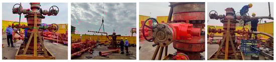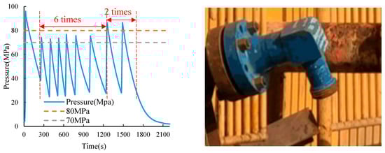 The assembly of the experimental bench is shown in Figure 3. The main body, pump, and storage tank were connected to high-pressure hoses at the experimental site. To ensure safety, the entire experimental site was enclosed with iron plates. Only after the pump is stopped and the internal pressure drops to zero can personnel enter the site to operate the valves.