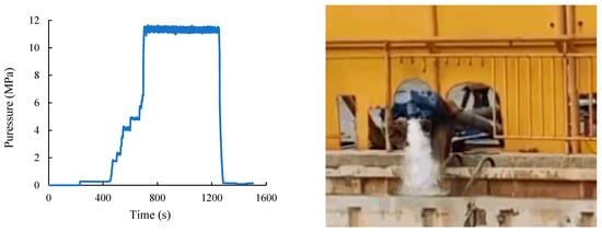 To eliminate the influence of defects in the experimental bench itself on the experimental results, a blank experiment was first conducted without filling any plugging material. The experimental results are presented in Figure 6. Under the throttling effect of the square crack, a pressure of approximately 11.5 MPa was generated internally. A clear water spray was observed at the outlet. Therefore, it can be concluded that the square cracks on the experimental bench have good passing ability. The experimental procedure was carried out in accordance with the CNPC SY/T 6276–2014 “High-Pressure Well Control Device Test Procedure” standard, and all pressure tests followed the safety and operational requirements specified therein.