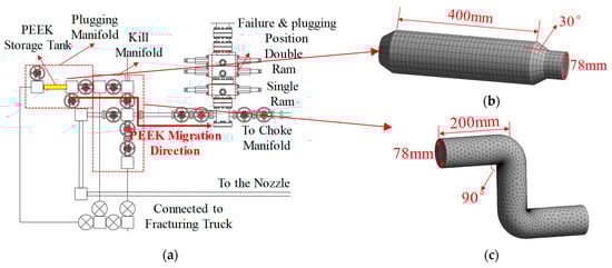(a) BZ3-1X actual plugging pipeline, (b) Modeling and meshing of PEEK storage tanks, and (c) Modeling and meshing of 90 °double bend.