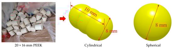 As shown in Figure 9, a particle model was established based on cylindrical and spherical particles. Preliminary research found that spherical particles exhibited the best plugging effect [2]. Cylindrical particles were used in the experiment because PEEK manufacturers currently do not have custom spherical molds. PEEKs can only be hot-processed into long cylinders and then manually sawn into small cylindrical particles individually. However, spherical particles may exhibit better transportation, trafficability, compressive strength, and plugging performance. If the project is promoted and implemented, the manufacturers could create molds for spherical particles, which can produce spherical particles in bulk and locally at a low cost. There are more options for on-site application, so the trafficability of pumping PEEKs in the pipeline of spherical particles was also verified.