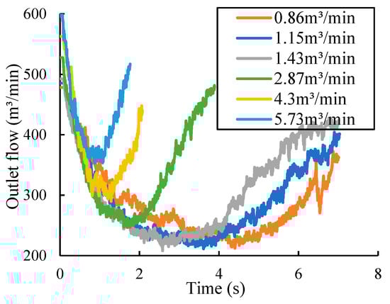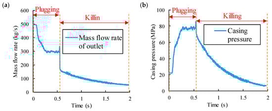From Figure 13a, the flow rate at the outlet decreased continuously with the start of plugging. After the formation of the plugging layer, the outlet flow rate remained at approximately 300 kg/s for approximately 0.1 s. From 0.55 s, as the killing continued, the flow rate of the outlet continued to decrease until the killing was completed.