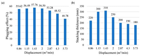 Combining Figure 11 and Figure 12a, the optimal plugging displacement is between 1–2 m3/min, which is a small-to-medium displacement. From Figure 12b, the stacking thickness formed by the medium and small displacements was significantly thicker. A possible reason for this is that when the displacement exceeded 2 m3/min, the particles were accelerated to rush out of the wellhead, resulting in a worse plugging effect.