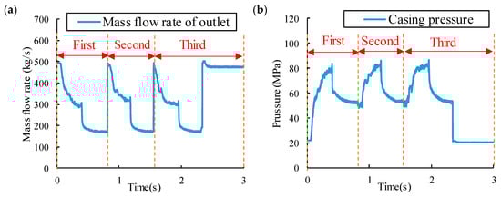 From Figure 14a, when the plugging layer collapsed owing to the late addition of plugging materials during the three plugging and killing operations, the puncture port returned to its initial state. After each plugging failure, the outlet flow rate returned to its initial level (approximately 500 kg/s). This is because the size of the outlet established in the simulation model remains constant; however, in practical situations, the puncture port becomes increasingly larger under the continuous erosion of formation fluids. Repeated plugging construction failures affect the subsequent plugging operations.