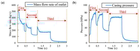 Changes in (a) mass flow rate of outlet and (b) casing pressure over time on the least ideal scenario.