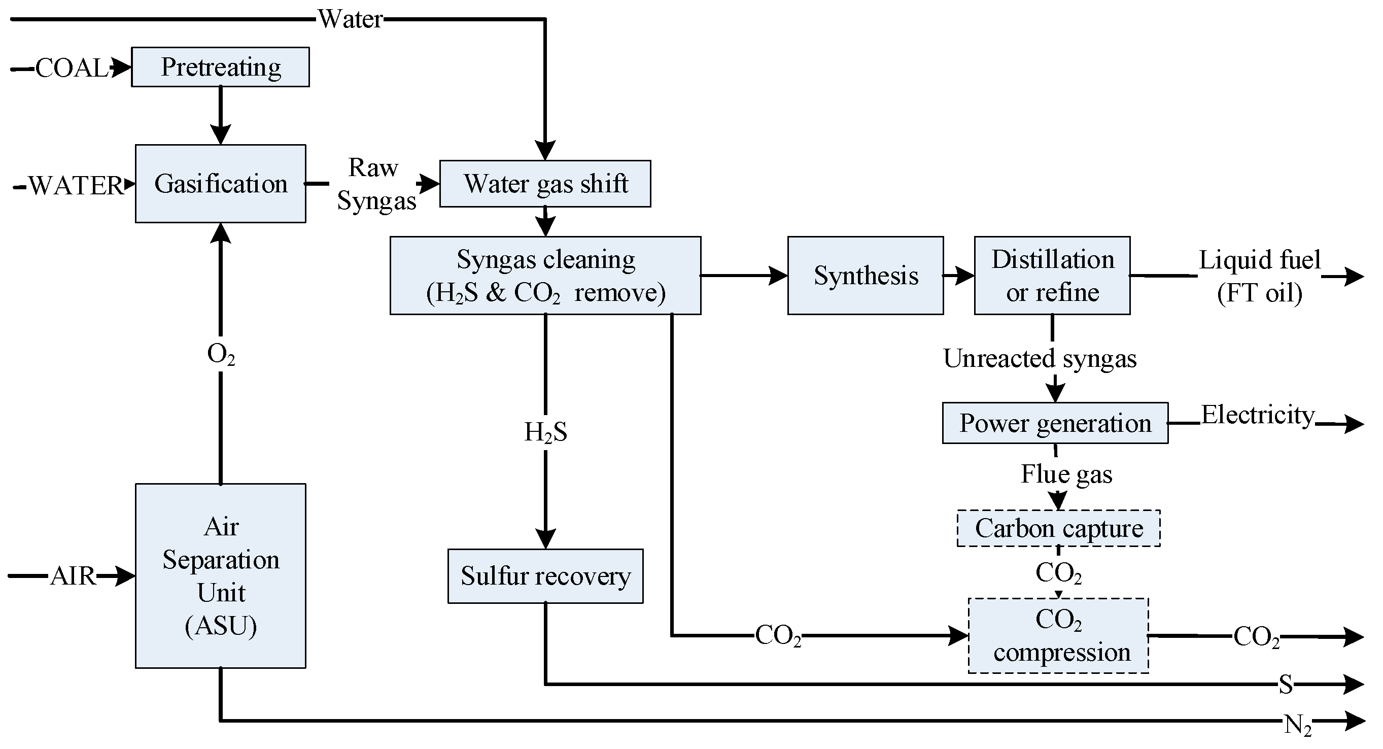 Carbon capture and storage (CCS) could be a vital choice for future clean energy production and climate change alleviation [4,5,6]. According to the International Energy Agency (IEA) [7], CCS could contribute up to 12% of global CO2 reduction by 2050. CCS technologies are recognized to reduce carbon emissions under supportive policy frameworks in China [8]. Several CCS projects have been launched in recent years, including those in China. In 2022, China’s first million-tonne-per-year integrated CCS project entered full operation. Additionally, Hua Neng initiated a 1.5 Mtpa coal-fired power CCS project, and several other companies have announced CCS projects [9]. CCS is considered a key cost-effective technology to facilitate the economic decarbonization of China’s industry [10,11]. Similarly, CTL and CCS technology (CTL-CCS) could be integrated to reduce CO2 emissions [12,13]. However, high investment costs remain one of the major barriers to the deployment of CTL-CCS, as is the case with its applications in power plants and other large industrial sources of CO2, particularly in the absence of carbon pricing mechanisms [14].