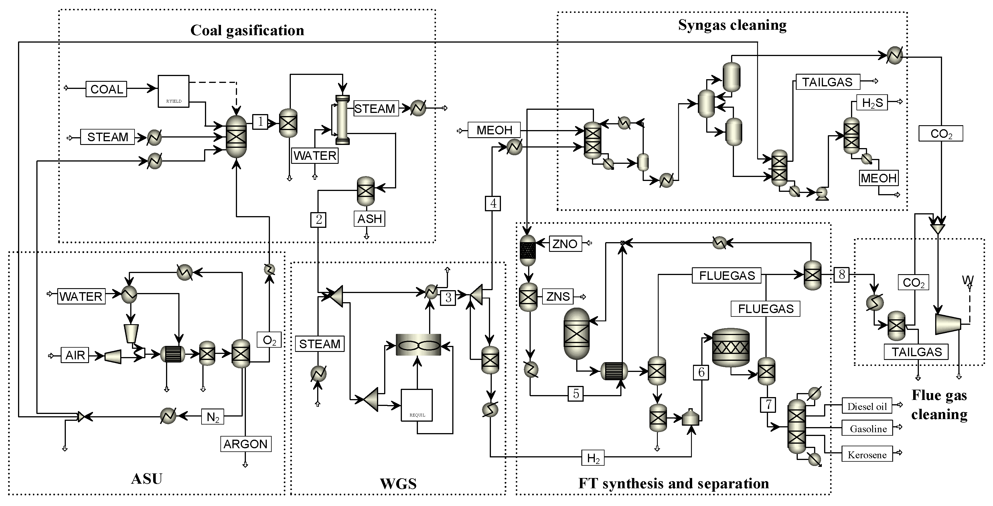 Until 2023, China had eight indirect liquefaction projects and one direct liquefaction project in operation. Four projects under construction were based on indirect liquefaction. Considering how indirect liquefaction technology is the dominant CTL technology in China, it was chosen to be simulated and analyzed. Figure 1 and Figure 2 present two configurations of indirect coal liquefaction using Fischer–Tropsch (FT) synthesis: one with recycling unreacted syngas (Figure 1) and the other with once-through synthesis combined with electricity generation from unreacted syngas (Figure 2). Each route can be integrated with or without CCS. Once-through synthesis with CCS is named FT-OT-CCS, while the one without CCS is named FT-OT. Similarly, the system that recycles unreacted syngas with CCS is named FT-RE-CCS, whereas that without CCS is named FT-RE.