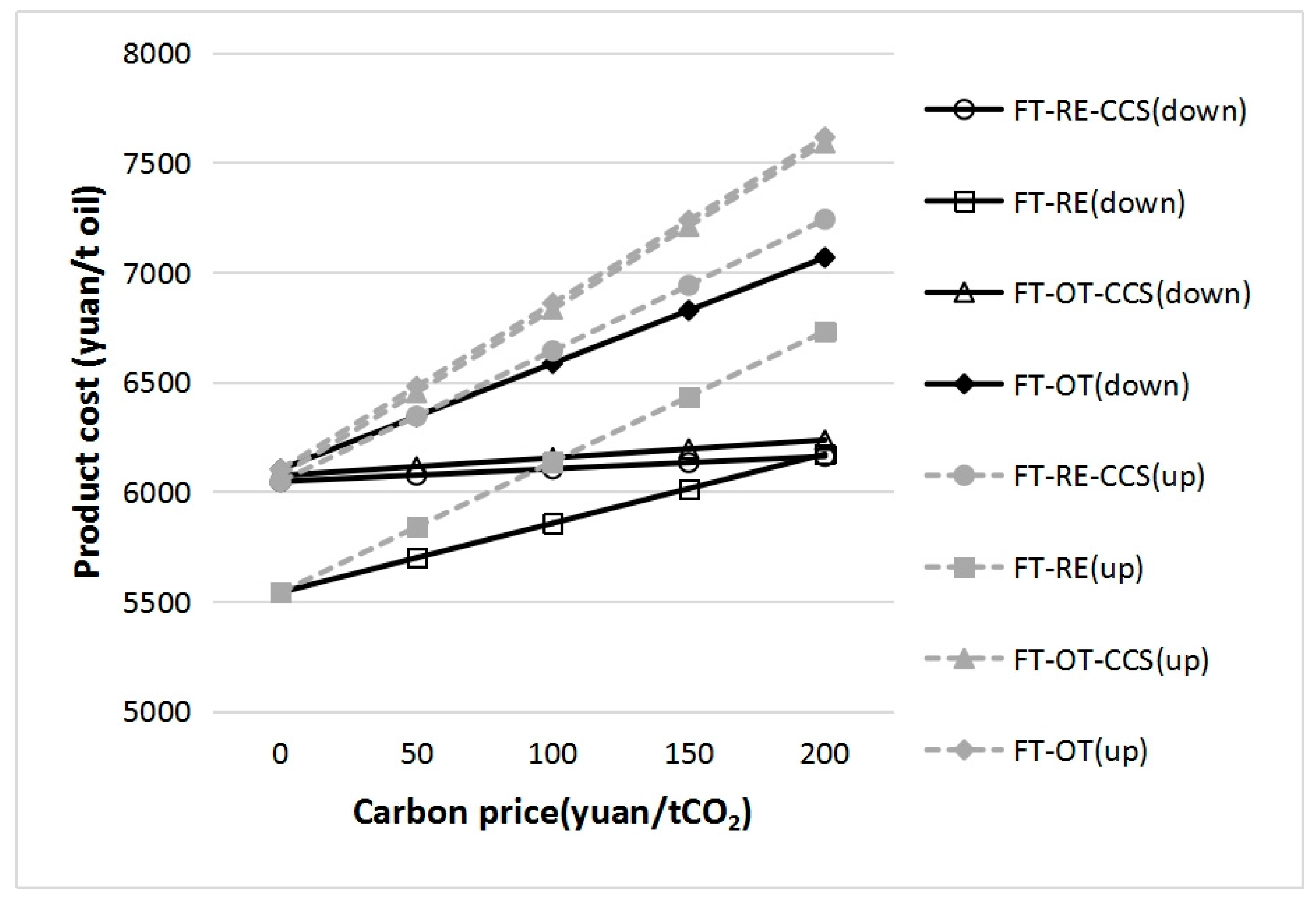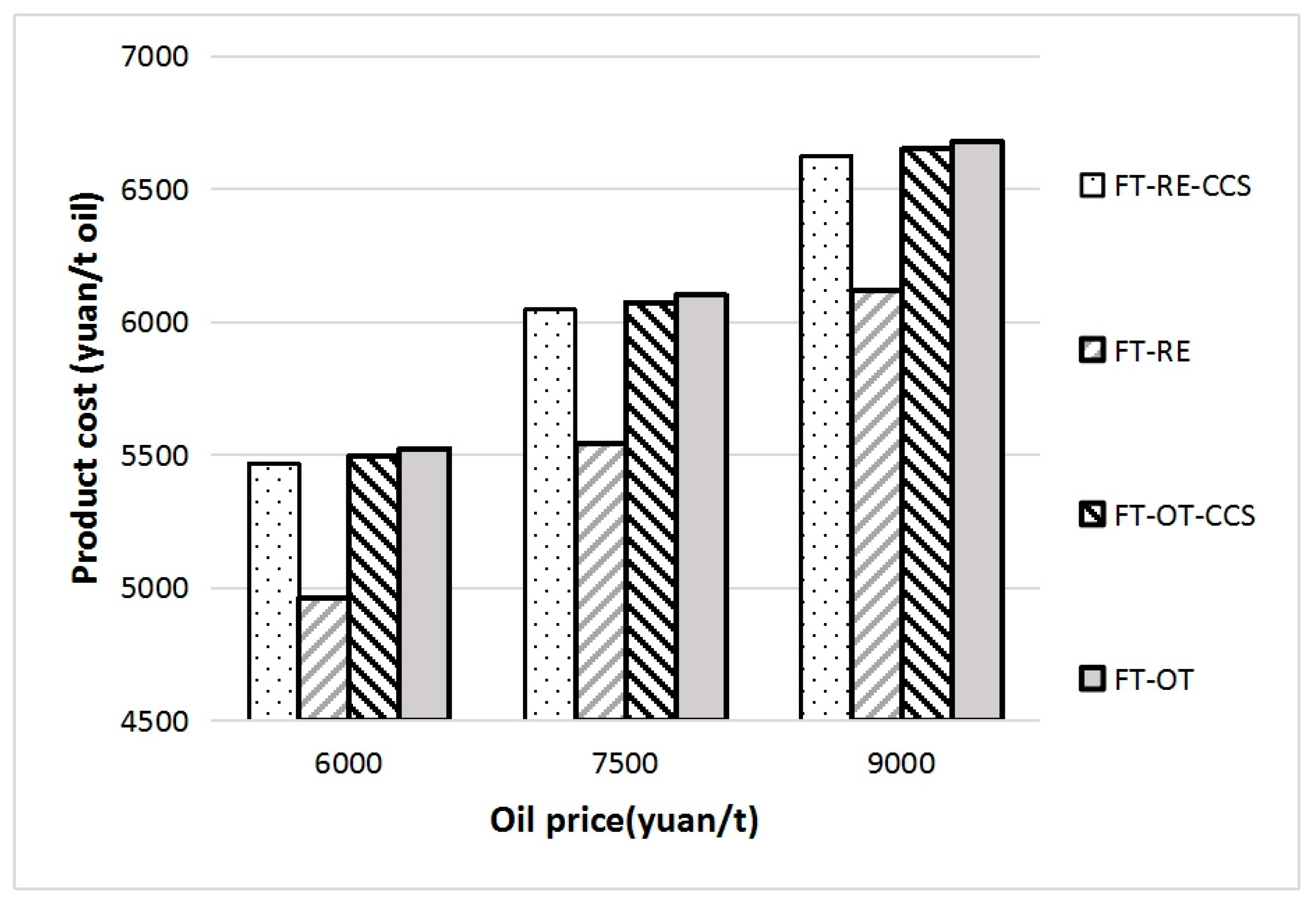 Given the volatility of global oil prices, a sensitivity analysis of product cost against varying oil prices is considered when there are no carbon prices, as shown in Figure 5. The higher the oil price, the higher the product cost. When the carbon price is higher, the relative product cost will increase with the same growth rate.