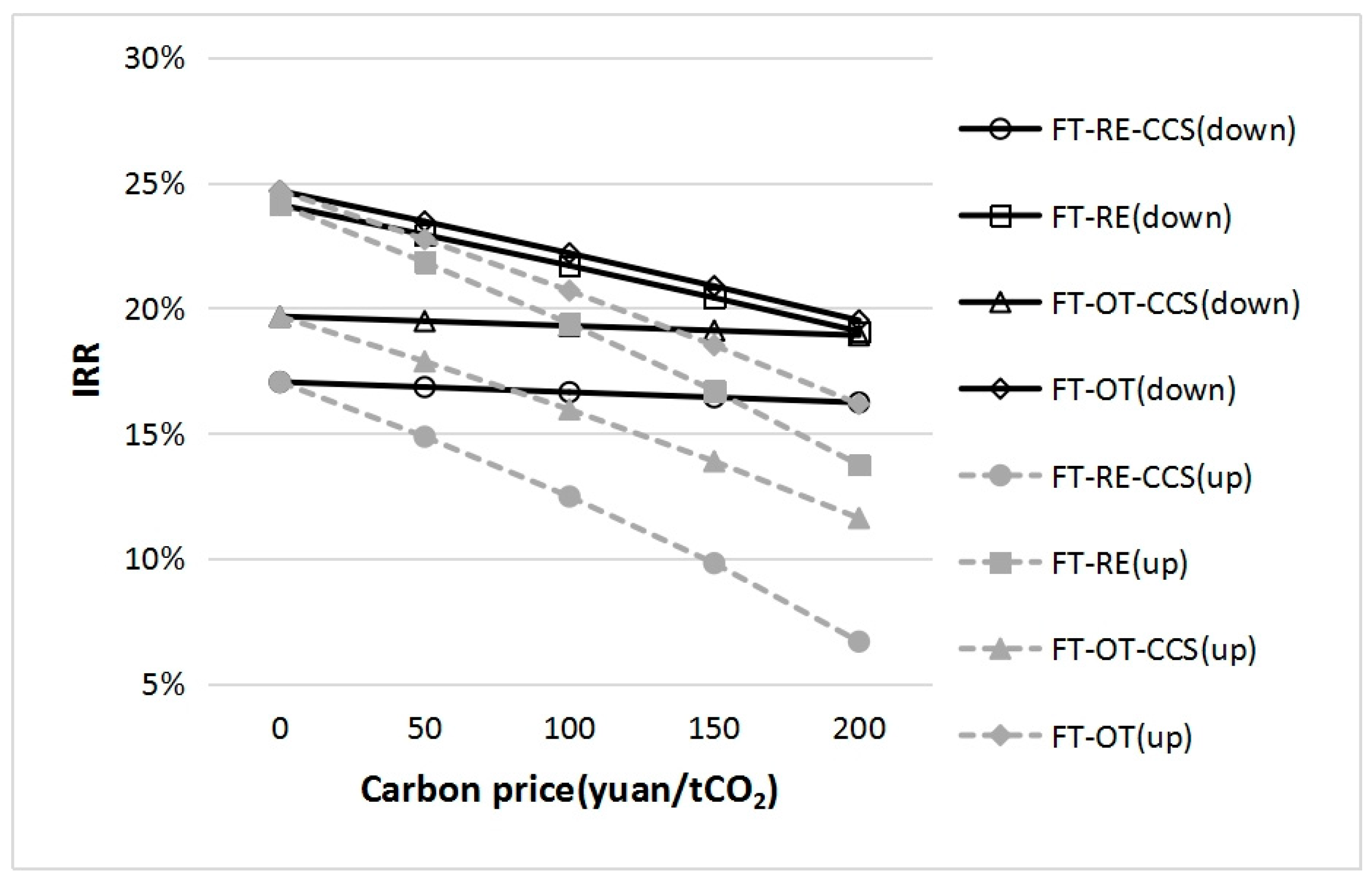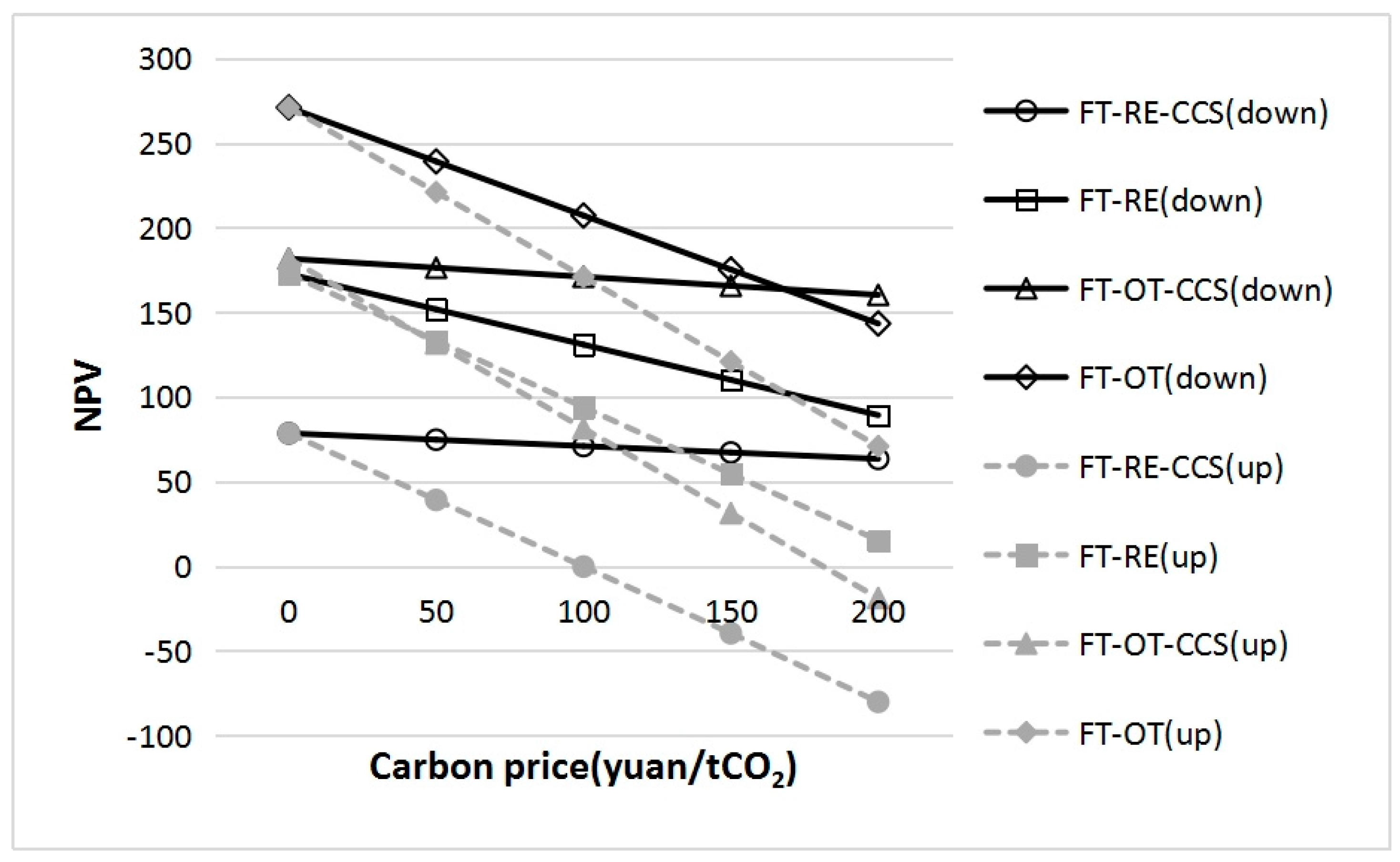 Figure 8 illustrates the impact of different carbon levy methods and price levels on the NPV. The upstream carbon tax has a greater effect than the downstream carbon price, reflected in a more rapid decline in NPV as carbon prices increase. In particular, the NPV of both FT-RE-CCS and FT-OT-CCS turns negative when the upstream carbon tax exceeds 100 and 180 RMB/tCO2, even though their IRR remains above 8%. In other words, when the upstream carbon tax is high enough, there will be no competitive economic advantage for the two technologies. In contrast, the impact of the downstream carbon price on a system with CCS is still relatively small. The output value of CCS is based on the carbon price. The smaller the gap between the cost of CCS technology application and the carbon cost, the smaller the impact of CCS application on NPV. Especially at a high carbon price, of 200 RMB/tCO2, adopting CCS technology has little influence on NPV for both FT-RE and FT-OT. Conversely, adopting CCS technology has more impact on NPV for both FT-RE and FT-OT at a lower carbon price. For example, when the downstream carbon price is 50 RMB/tCO2, adopting CCS technology can decrease NPV of FT-RE and FT-OT by 51% and 26%, respectively.
