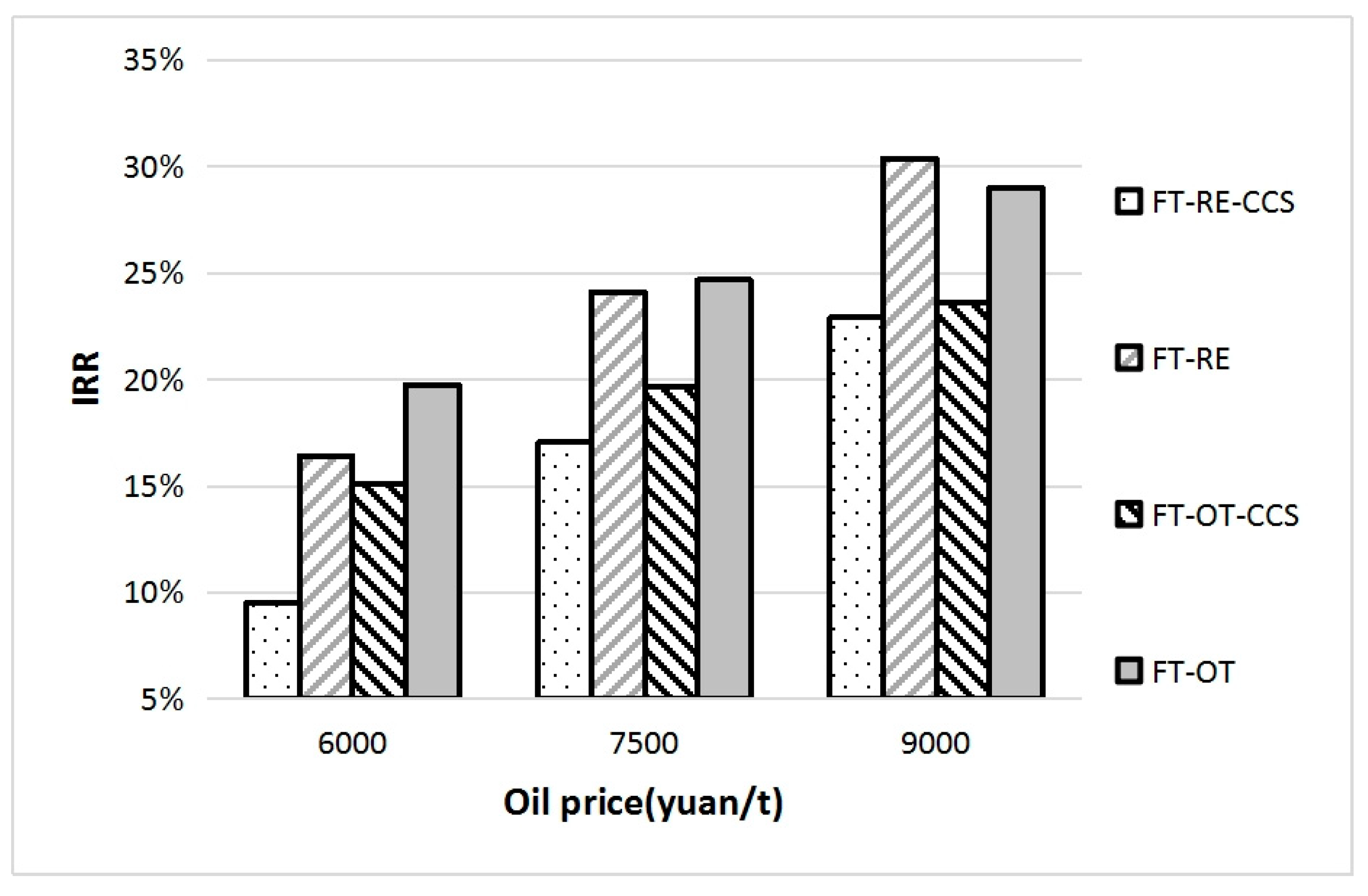 A sensitivity analysis of IRR against varying oil prices is considered when there are no carbon prices, as shown in Figure 7. The higher the oil price, the higher the IRR. When the carbon price is higher, the relative IRR will decrease with the same growth rate.