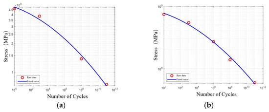 Literature [40] indicates that “Structural Steel BS4360 Grade 40B” in nCode can be used for simulation. The S-N curve of this material is shown in Figure 1a, fitted using the software’s built-in fitting method. This study adopts the fatigue characteristic calculation method provided by the Chinese standard [41]. For X80 steel with a tensile strength of 739 MPa, the reference data points for “unalloyed and low-alloy steels not exceeding 370 °C” were selected for interpolation calculations. After interpolation processing, standardized fatigue characteristic parameters were obtained. Using data fitting methods, the S-N curve for X80 was established, as shown in Figure 1b.