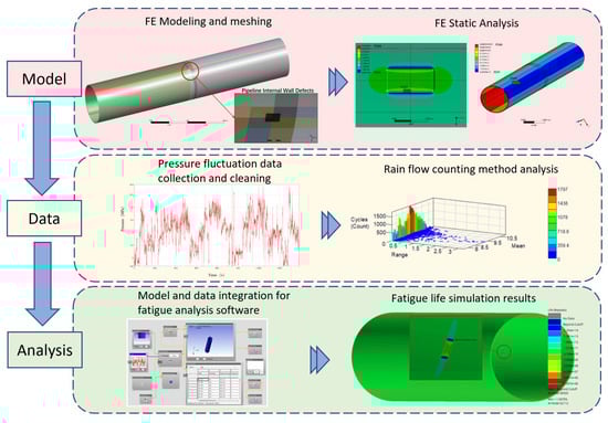 The finite element simulation of fatigue life comprises five fundamental steps: First, engineering data is collected and field measurements are conducted on specific long-distance pipelines to obtain information such as pipe diameter, wall thickness, corrosion defect dimensions, and operational pressure fluctuations. Next, based on pipeline and defect parameters, the value ranges for FE simulation are determined, and a load spectrum is established by analyzing pipeline pressure fluctuations. Subsequently, static analysis based on the FE Method is performed to derive the stress distribution under constant pressure, thereby obtaining the stress spectrum. Then, within the fatigue failure calculation engine, utilizing cumulative fatigue damage theory, the S-N curve, and the stress spectrum, the fatigue life of pipelines with different specifications, materials, and defect characteristics is determined. Finally, fatigue vibration experiments are used to validate and optimize the prediction results. The overall process of finite element simulation is shown in Figure 2.