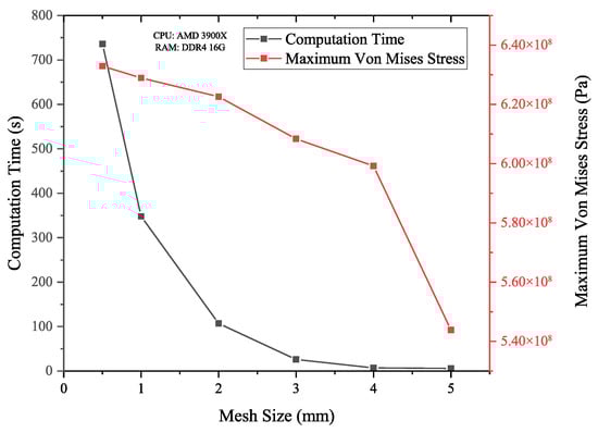 This study employs the SpaceClaim module within Ansys Workbench for modeling. The specific pipeline parameters are listed in Table 2. To balance computational cost with result accuracy, the model length was set to six times the pipe diameter, a distance sufficient per Saint-Venant’s principle to isolate the defect-area stress field from boundary effects. Both ends were assigned frictionless supports (constrained radially and circumferentially, free axially) to approximate an infinitely long pipeline. This boundary condition permits axial deformation under pressure, mimicking real pipeline behavior and preventing spurious stresses from fully fixed constraints. Given the axisymmetric nature of the pipeline, a hexahedral mesh with good numerical stability and convergence is adopted. A mesh sensitivity analysis was performed to guarantee that the simulation outcomes were independent of the mesh density. The element size in the defect area was varied from 5 mm down to 0.5 mm. Figure 3 illustrates the findings, where the maximum von Mises stress at 10 MPa internal pressure and the required computation time served as the evaluation metrics.