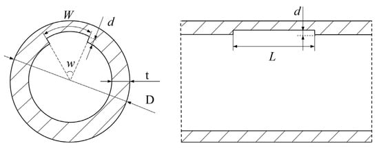 Cross-section and longitudinal section of pipeline containing square corrosion defects. In this figure, D denotes the pipeline diameter, d is the defect corrosion depth, L is the axial corrosion length, W is the circumferential corrosion width.