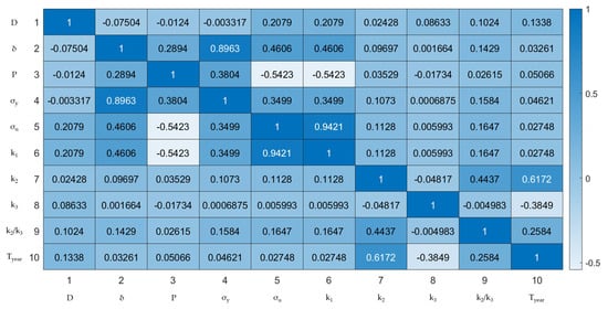 Figure 5 displays the distribution of input and output variables and their pairwise relationships, revealing correlations and potential relationships between variables. Features (Lines 1~9) are pipe diameter D (mm), wall thickness δ (mm), operational pressure P (MPa), yield strength σy (MPa), ultimate tensile strength σu (MPa), defect depth coefficient k1, defect length coefficient k2, defect width coefficient k3, and defect aspect ratio k2/k3, respectively. Feature line 10 is the fatigue life Tyear (years).