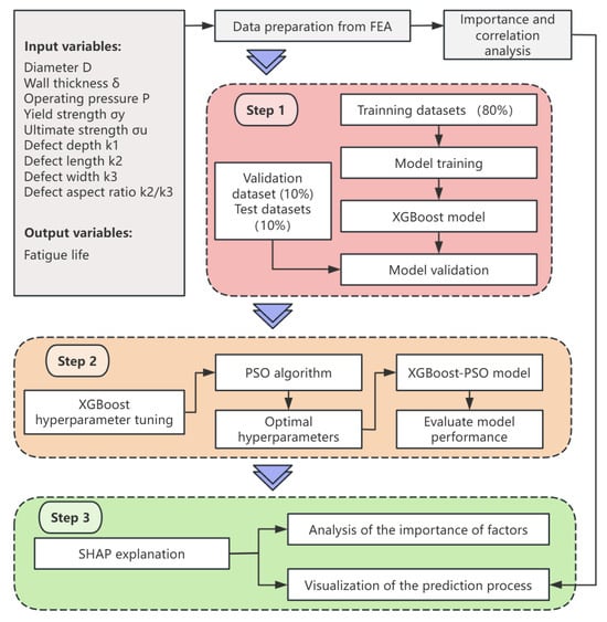 To achieve high-precision prediction and visualization of the prediction process for the fatigue life of long-distance natural gas pipelines with internal corrosion defects, this paper proposes a novel method based on PSO-XGBoost-SHAP. Figure 6 illustrates the analytical framework of this model, with the specific steps as follows.