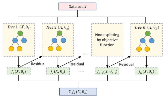 XGBoost is an enhanced algorithm of Gradient Boosting Decision Trees (GBDT) that introduces a series of innovative techniques in training speed and model performance. The flowchart of XGBoost is shown in Figure 7. Let the training dataset D = {(x1, y1), (x2, y2), …, (xN, yN)}, where xi is the input feature and yi is the corresponding label.