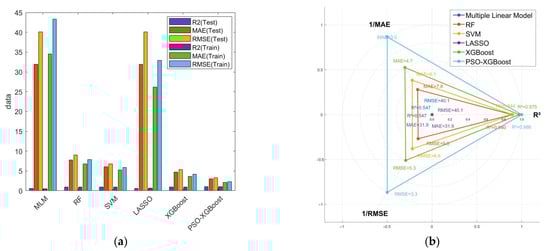 To confirm the reliability and effectiveness of the developed PSO-XGBoost model results, this study established multiple benchmark machine learning models for comparative analysis, including Multiple Linear Regression, Random Forest (RF), Support Vector Machine (SVM), LASSO, and XGBoost. All models were trained using 10-fold cross-validation. Figure 8 shows the comparison results of prediction accuracy (R2) and Mean Absolute Error (MAE) for these models. The PSO-XGBoost model with default parameters already possesses the highest prediction accuracy (R2 = 0.9881) and the smallest error (MAE = 3.0049). Compared to the RF, SVM, and XGBoost models, the prediction accuracy (R2) of PSO-XGBoost improved by approximately 5.1%, 4.7%, and 1.3%, respectively. The RF model performed well on the dataset, but PSO-XGBoost was superior; the XGBoost model showed high accuracy, but its performance was further improved after PSO, with the R2 value increasing from 0.97549 to 0.9881. This indicates that the PSO-optimized XGBoost model possesses excellent performance in the prediction task. From the perspective of error metrics, the MAE of the PSO-XGBoost model is 3.0049, significantly lower than other benchmark models, further verifying its superior predictive capability. To substantiate the significance of this improvement, pre-experiments were conducted to compare several optimization algorithms, including Bayesian Optimization, RIMA, and SSA, alongside PSO. Among these, PSO achieved the highest performance gain, whereas Bayesian Optimization resulted in a reduction of −1.96%, and RIMA and SSA yielded improvements of 1.18% and 0.83%, respectively. These comparative results highlight that the performance gain achieved by PSO is not only consistent but also the most pronounced among commonly used optimizers.