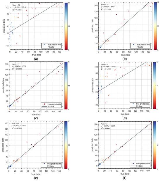 Prediction results of fatigue life in training and test set: (a) Multiple Linear Model; (b) RF; (c) SVM; (d) LASSO; (e) XGBoost; (f) PSO-XGBoost.