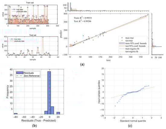 Model results presentation: (a) Comparison of prediction accuracy; (b) Residual histogram; (c) Residual Q-Q plot. Blue plus symbols represent the observed residual values from the dataset. Each “+” corresponds to a single residual. Beige dash-dot line represents the theoretical quantiles of a standard normal distribution.