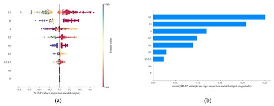 Figure 12a shows the distribution of SHAP values for different feature variables across their values for all samples. This chart clearly presents the influence patterns of different feature variables on the model prediction process globally. The feature varia-bles k1 and D have the widest distribution ranges of SHAP values, located at the top of the chart, showing substantial positive and negative impacts, indicating that they have very different effects on the model’s prediction results for different observed values.