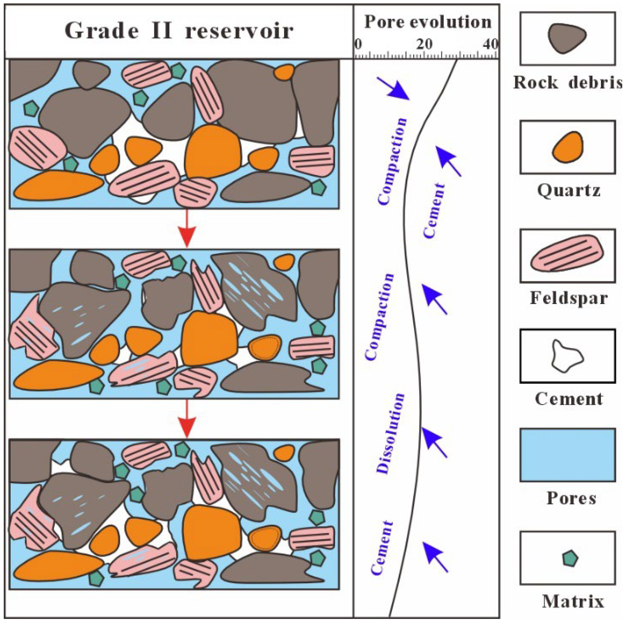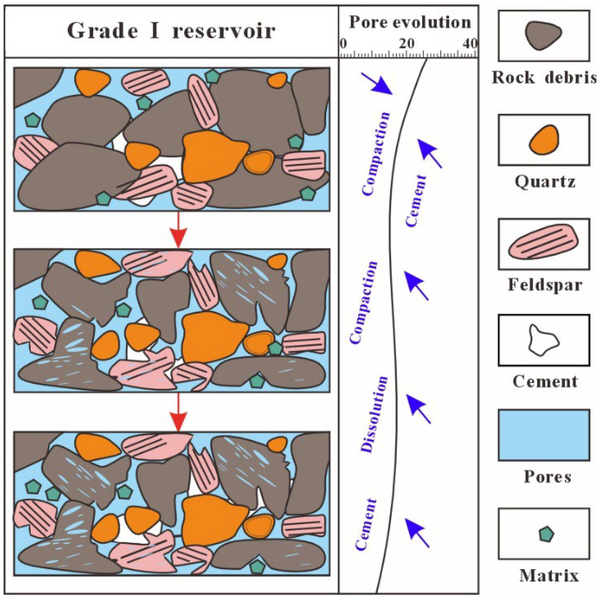 | Reservoir Type | Original Porosity (%) | Compaction Loss Porosity (%) | Cementation Loss Porosity (%) | Dissolution Increase Porosity (%) | Current Porosity (%) |