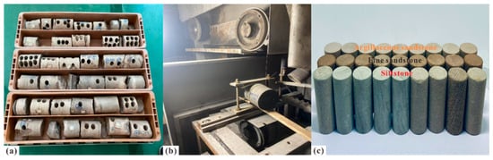 The target depleted gas reservoir in this study is located in an oilfield in western China. The reservoir is developed in the Paleogene sandstone formation. Affected by multiple tectonic movements in the Himalayan period, it forms a “fault–sandbody” composite reservoir. The reservoir has favorable petrophysical properties, with porosity ranging from 21.5% to 23.7% and permeability between 38.86 mD and 175.5 mD, classifying it as a medium to high-porosity and medium to high-permeability system. An underlying aquifer is present at the base of the reservoir, and edge water has invaded some sandstone intervals along faults, resulting in changes in the water saturation in near-water wells. Up to now, the UGS has completed multiple injection-production cycles. Sand production has been observed in some production wells, indicating the degradation of rock mechanical properties around the wellbore. Based on these reservoir characteristics, three representative lithologies—siltstone, fine sandstone, and argillaceous sandstone—were selected for core sampling, which are consistent with the lithology distribution interpreted by on-site logging. Downhole rock cores were retrieved from depths ranging from 2381.98 m to 2651.20 m, and the core samples were processed into standard cylindrical samples, as shown in Figure 1.