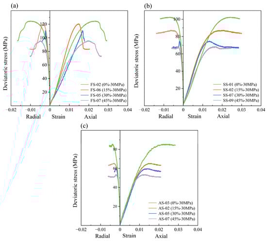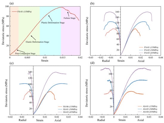 Conventional triaxial compression tests were conducted to determine the mechanical strength of three core lithologies under varying confining pressures. Taking the fine sandstone specimen FS-01 as a representative example, the stress–strain curve obtained from the experiment can be divided into four distinct stages, as illustrated in Figure 3a. In the initial pore compaction stage, the curve exhibits a concave upward shape, with a gradually increasing slope and slow stress accumulation. This behavior reflects the compaction of internal pores under increasing external load. During the subsequent elastic deformation stage, the curve becomes approximately linear, conforming to Hooke’s law. At this stage, microcracks may initiate or extend stably, but the material has not yet undergone structural failure. Once the stress surpasses the elastic limit, the curve transitions into the plastic deformation stage. Here, internal microcracks propagate more consistently, leading to a decrease in the slope of the curve. This stage is characterized by a nonlinear convex relationship between stress and strain, where strain increases rapidly while stress rises at a slower rate. Upon reaching peak strength, the bonding between rock grains is significantly compromised, resulting in the rapid coalescence of microcracks into macroscopic fractures—marking the onset of failure. In the post-peak failure stage, load-bearing capacity is primarily maintained by frictional resistance along fracture surfaces. Although stress declines sharply, residual strength persists, and strain continues to increase, ultimately resulting in shear failure along the dominant fracture plane. It should be noted that the mechanical behavior at sandstone–mudstone interfaces has not been studied in this research, due to the lack of interlayer samples.