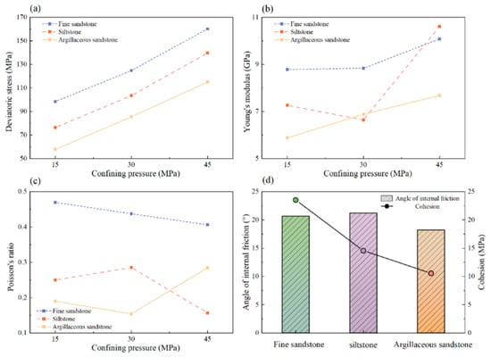 Based on the triaxial compression test results, key rock mechanical parameters—including Young’s modulus, Poisson’s ratio, internal friction angle, and cohesion—were determined for the three sandstone lithologies, as summarized in Table 2. Figure 4a–c illustrates the relationships between selected mechanical parameters and confining pressure.