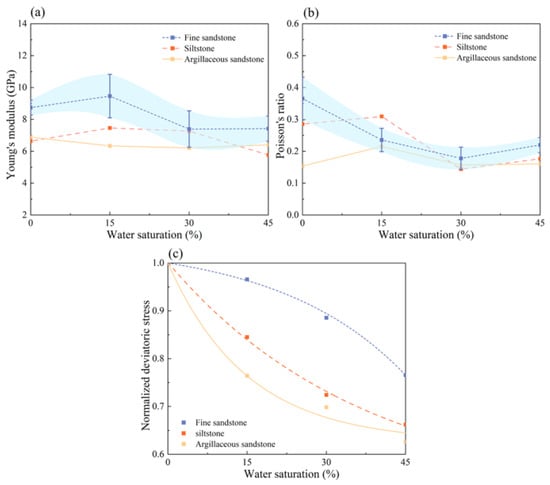 The variation of rock mechanical parameters with different water saturation. (a) Young’s modulus; (b) Poisson’s ratio; (c) Normalized deviatoric stress. The blue color part represents the range of the error bars.