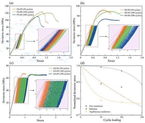 The stress–strain curve of rocks with different cyclic loading. (a) Fine sandstone; (b) Siltstone; (c) Argillaceous sandstone; (d) Variation of deviatoric stress.