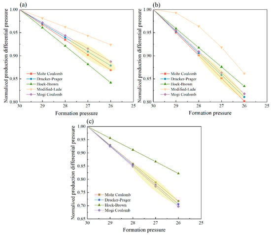To further assess the applicability of various rock strength failure criteria in estimating the production pressure differential, the relationship between reservoir pressure and production pressure differential was analyzed for the target block (Figure 9). As production progresses and reservoir pressure decreases, the corresponding production pressure differential showed a clear linear decline. Among the three lithologies, argillaceous sandstone demonstrated the highest sensitivity to pressure depletion, exhibiting a 30.30% reduction in production pressure differential from the initial to the current formation pressure. Siltstone showed a 19.23% decrease, while fine sandstone was least affected, with a reduction of only 12.14%.