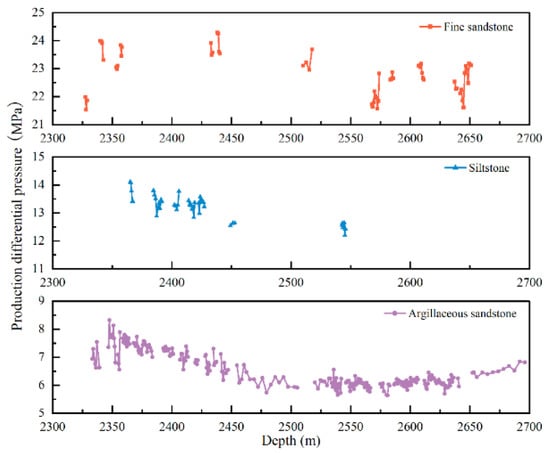 The production pressure differential profile for a well in the depleted gas reservoir of the target block, calculated using the Mogi–Coulomb criterion, is presented in Figure 10. This profile facilitates the identification of reservoir lithology and its corresponding production pressure differential at any given depth. The average production pressure differentials for fine sandstone, siltstone, and argillaceous sandstone in the target well were 23.01 MPa, 13.27 MPa, and 6.89 MPa, respectively.