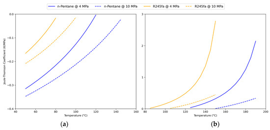 Thermodynamic properties of the three fluids under study (water, n-pentane, and R245fa) can be found in Table 1. While the acentric factor captures how much a fluid deviates from spherical molecular behavior, the dipole moment quantifies polarity and directly relates to intermolecular forces. Thus, n-pentane’s lower acentric factor and negligible polarity reflect simple hydrocarbon behavior, whereas R245fa’s higher acentric factor and significant dipole moment indicate both molecular non-sphericity and stronger polar interactions. Both organic fluids are more compressible than water, making Joule–Thomson (JT) cooling effects significant under depressurization, as shown in Figure 1. As illustrated, the JT values become positive above 80–100 °C, indicating that depressurization could induce cooling, a behavior that must be accounted for in the modeling approach.