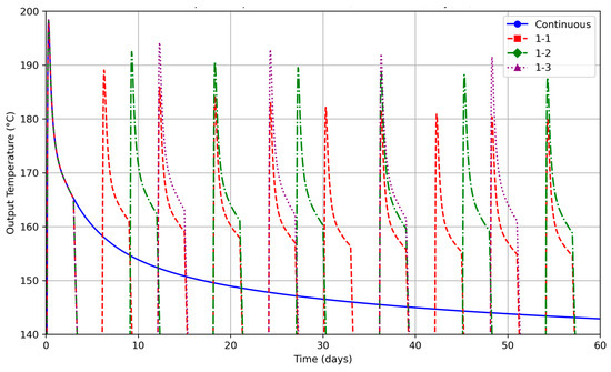 As highlighted in the literature review, studies of intermittency for high enthalpy CBHEs remain limited. Our simulations confirm that the general trends observed in low-enthalpy systems also apply at higher enthalpy levels: longer recovery periods yield higher outlet temperatures during subsequent run cycles. Figure 5 illustrates this behavior by comparing continuous operation with three different run-recovery ratios (1-1, 1-2, and 1-3) for a run duration of three days per cycle.