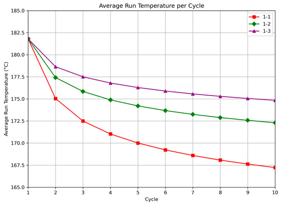 To further characterize cyclic performance, Figure 6 presents the average outlet temperature for the three run-recovery ratios. The spacing between curves is nonlinear, indicating diminishing gains as recovery time is extended. The average temperature profiles also mirror the qualitative behavior of continuous operation, with decline rates slowing over time.