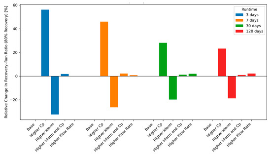 Figure 7 illustrates how the recovery–runtime ratio responds to variations in thermal and operational parameters for four cycle lengths (3, 7, 30, and 120 days). The recovery–runtime ratio is defined as the time required for the bottomhole formation temperature to recover to 80% of its pre-production value (θ = 0.8), divided by the preceding operational runtime. Thus, values greater than the base case (positive deviations) indicate slower recovery relative to runtime, whereas negative deviations indicate faster recovery. The results in Figure 7 show that higher formation thermal conductivity accelerates recovery across all cycle lengths, consistent with the enhanced conductive heat transport and in agreement with [32]. Higher heat capacity slows recovery, as more energy is stored before temperature changes occur. When both parameters are increased, the effects counteract, reflecting the governing role of thermal diffusivity. The influence of flow rate (red bars) is comparatively minor at short runtimes but becomes more visible for the 30- and 120-day cycles, where longer extraction periods amplify small operational differences. Extreme flow regimes remain to be investigated.